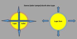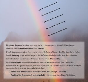 Das gleiche Phänomen ist zu sehen, wenn ich die Sonne in die Lupe nehme. Das klare Bild der Sonne ist der Brennpunkt. Wenn ich die Lupe der Reflexionsfläche annähere, bleibt es das Bild der Sonne und es bildet sich ein farbiger Saum. Es sind die Farben des Regenbogens (Außen rotviolett, rot, über gelb, grün, blau nach innen sich verändernd – siehe Bild 4 und 13).