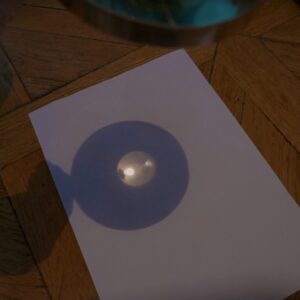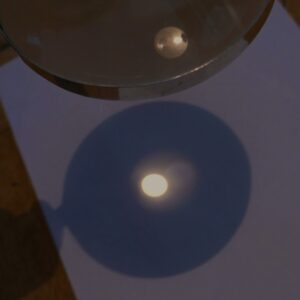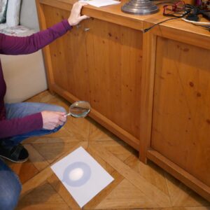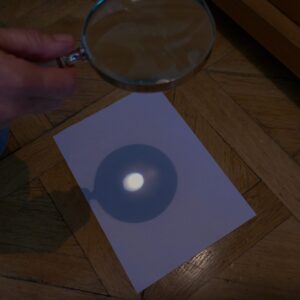 Auf den folgenden Bildern (8, 9, 10, 11) wird mit Hilfe einer Linse demonstriert, was sich verändert, wenn man die Lupe, wie hier, an das Blatt Papier annähert und entfernt (Bild 12). Bei einer bestimmten Distanz erhält man das klare Bild der Lampe. Bei Annäherung als auch bei Entfernung wird das Bild unklar. Ist die Lupe nahe am Blatt, sieht man einen roten Rand, bei Entfernung einen blauen. Ob klar oder unklar, es bleibt das Bild der Lampe.