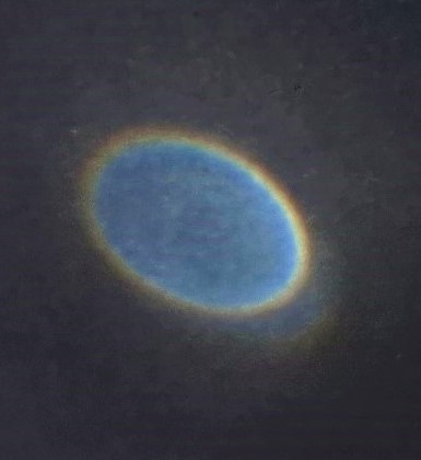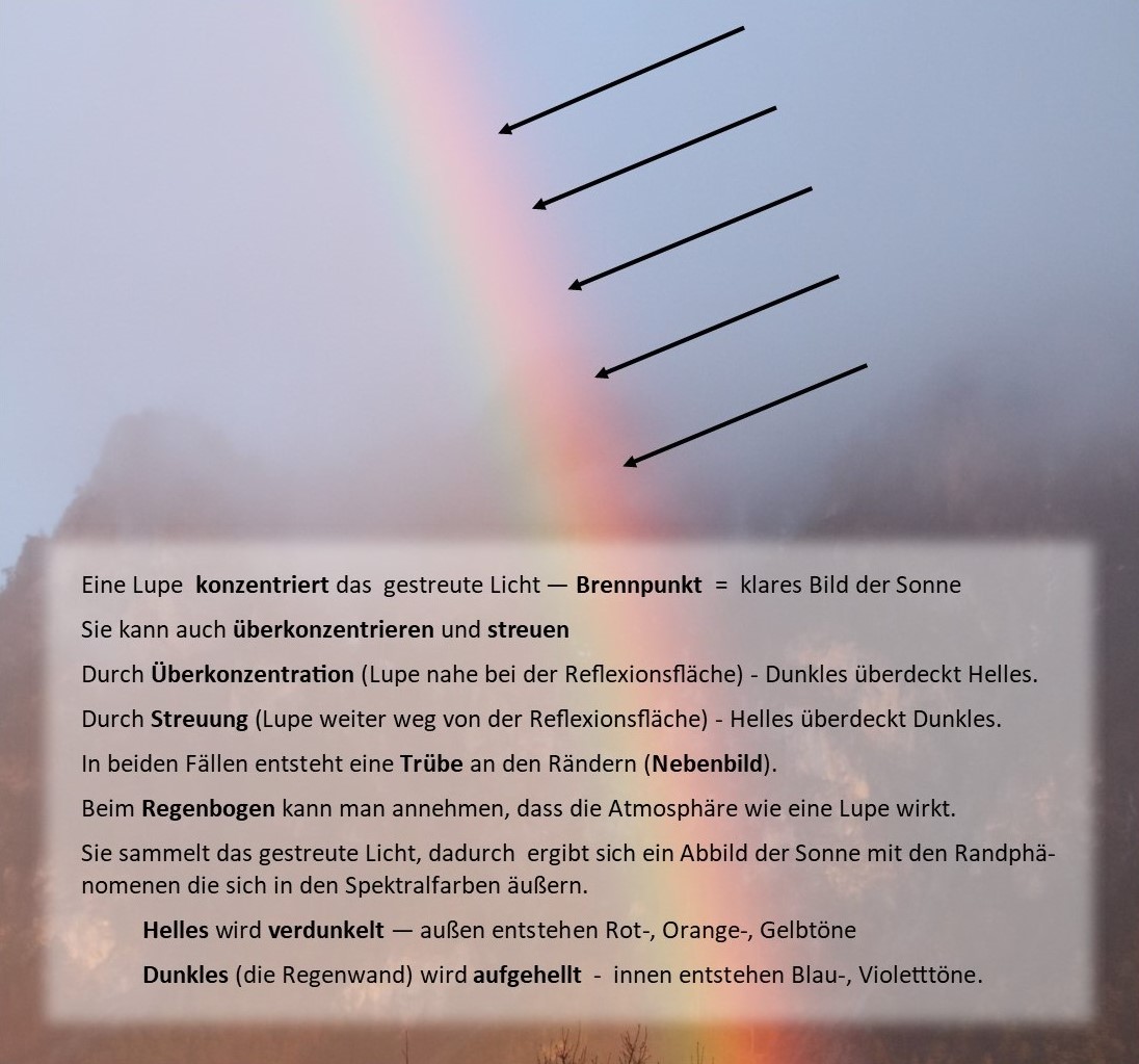 Das gleiche Phänomen ist zu sehen, wenn ich die Sonne in die Lupe nehme. Das klare Bild der Sonne ist der Brennpunkt. Wenn ich die Lupe der Reflexionsfläche annähere, bleibt es das Bild der Sonne und es bildet sich ein farbiger Saum. Es sind die Farben des Regenbogens (Außen rotviolett, rot, über gelb, grün, blau nach innen sich verändernd – siehe Bild 4 und 13).