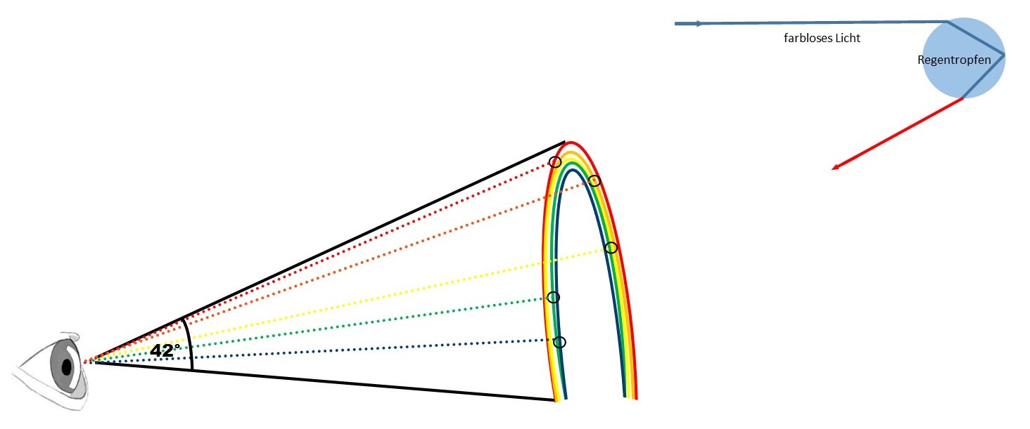 Die gängige Vorstellung der Regenbogenentstehung geht davon aus, dass es die einzelnen Regentropfen sind, die das Sonnenlicht durch doppelte Brechung und Reflexion in unser Auge senden (Bild 5). Auf diese Weise sollen, je nach Stärke der Brechung, die unterschiedlichen Farben des Bogens in unserem Auge erscheinen. Das kann sich aber nur ergeben, wenn der Mensch an der Spitze eines Konus steht, der sich in einem ungefähren Winkel von 42° ausbreitet (Bild 5). Das würde bedeuten, dass jeder Mensch seinen eigenen Regenbogen sieht. Die Wahrnehmung des Regenbogens wäre somit ein rein subjektives Erlebnis.