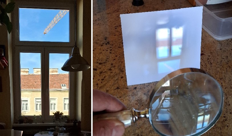 Zunächst ist es wichtig, zu verstehen, wie Bilder entstehen. Wie unser Auge hat auch eine Kamera eine Linse, die Ausschnitte der Umwelt auf eine Reflexionsfläche projiziert. Das in der Atmosphäre gestreute Licht wird durch die Linse gebündelt. Das Bild, welches darauf erscheint, hat sich umgekehrt. Mit einer Lupe erreicht man Gleiches (siehe Bild 6 und 7). Wenn ich die Lupe gegen eine größere Fläche halte, etwa eine Wand, und mich dann mit der Lupe in der Hand entlang der Wand weiterbewege, geht dieses Bild vom Fenster mit mir mit. Die Position ändert sich und die Erscheinung bleibt erhalten. Das Bild ist also, obwohl ich meine Position ändere, das reale Abbild des Fensters. Kann ich unter diesem Aspekt sagen, die Farben und Formen des Fensterbildes setzen sich erst, abhängig vom Betrachtungswinkel, in meinem Auge zusammen? Ich bin der Ansicht, dass ich sie als Ganzheit erfasse. So ist es auch mit dem Regenbogen. Verändere ich meine Position, sehe ich den Regenbogen trotzdem und ich nehme ihn als Ganzheit wahr, er könnte sich sonst nicht spiegeln. Der Bogen und die Helligkeit im Inneren sind somit ein reales Abbild der Sonne – eine Spiegelung der Sonne in der Regenwand. Die Regenwand ist unter diesem Aspekt der Spiegel und nicht die einzelnen Regentropfen, denn das Bild des Fensters, das mit der Lupe auf die Wand projiziert wird, entsteht nach dem gleichen Prinzip. Das ist auch die grundsätzliche Funktionsweise einer Kamera.