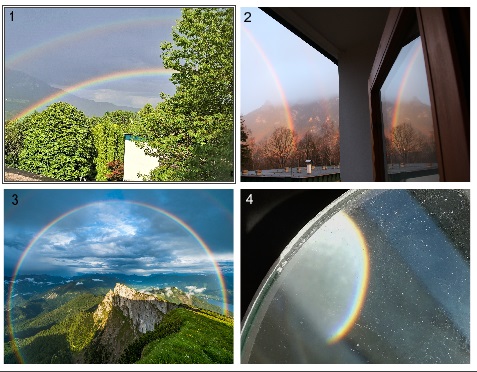 In allen vier Bildern ist ersichtlich, dass es im Inneren der Bögen heller ist als außerhalb. Bild zwei zeigt einen gespiegelten Regenbogen und Bild drei, dass es auch kreisrunde Bögen gibt. In Bild vier ist zu sehen, was erscheint, wenn man die Sonne mit einer Lupe auf ein dunkles Blatt Papier projiziert. Im Folgenden möchte ich darstellen, warum diese Wahrnehmungen für die Beurteilung der Regenbogenentstehung wichtig sind.